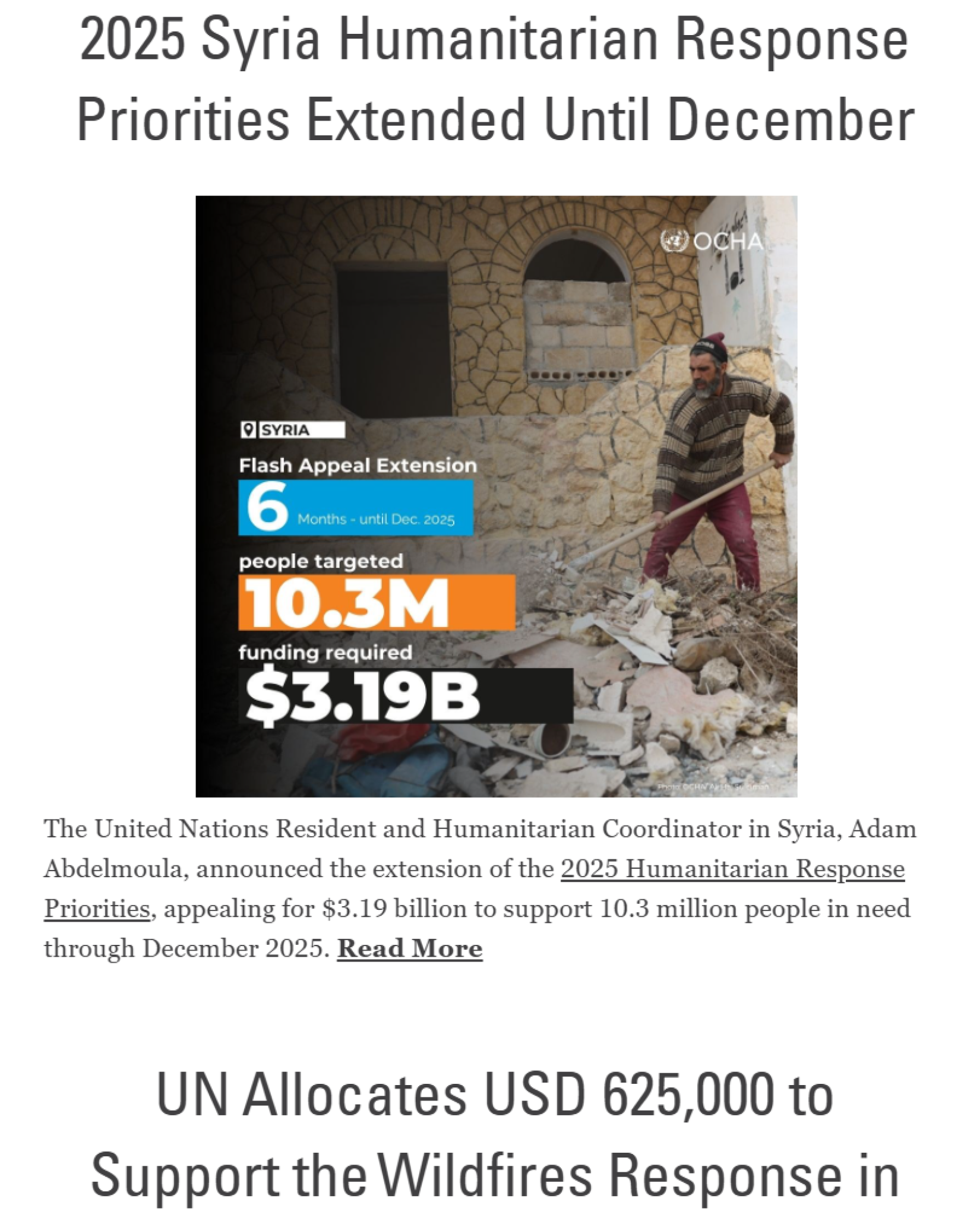 Key developments include the delivery of life-saving aid to As-Sweida through a major UN convoy, emergency funding to respond to wildfires in Lattakia, and the deployment of mobile health teams to support displaced populations. The newsletter also underscores the UN’s concern for children’s psychosocial wellbeing and showcases progress in food security, with emergency rations and fortified wheat flour reaching millions.